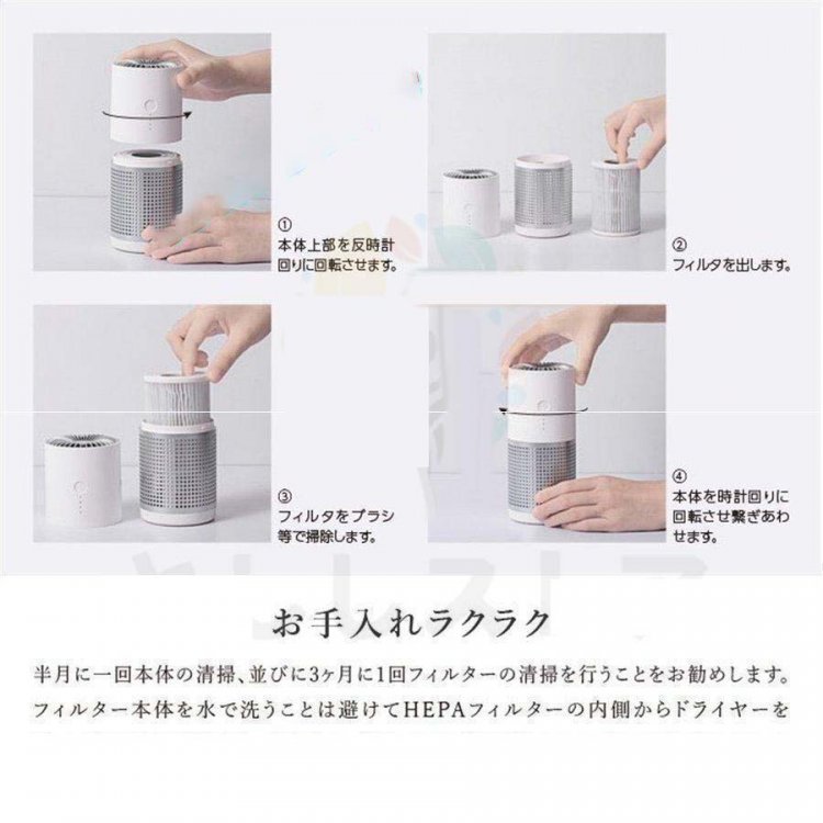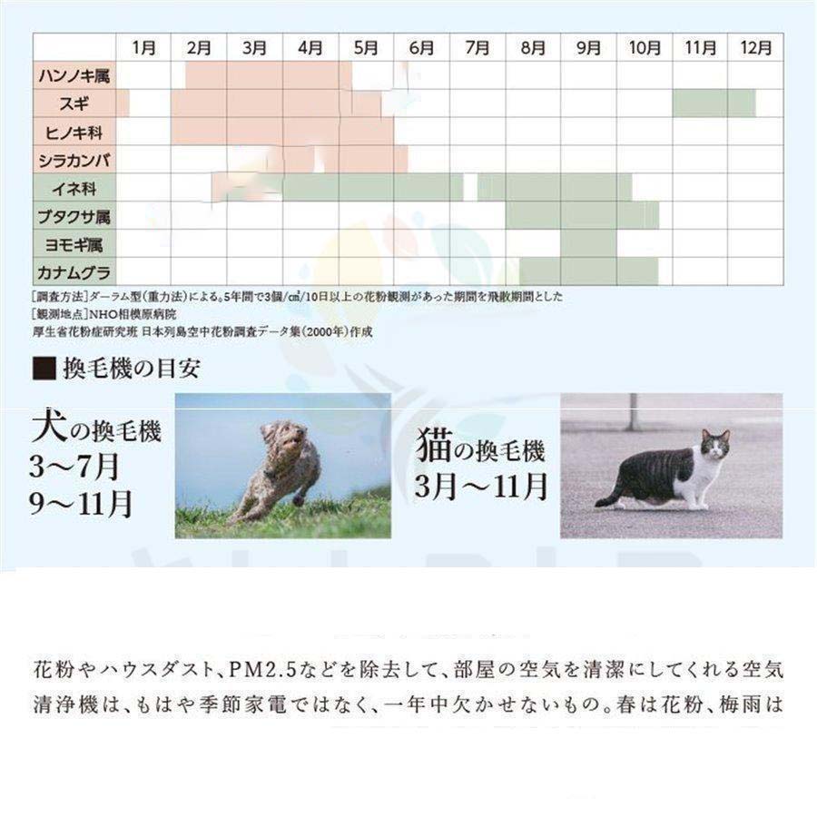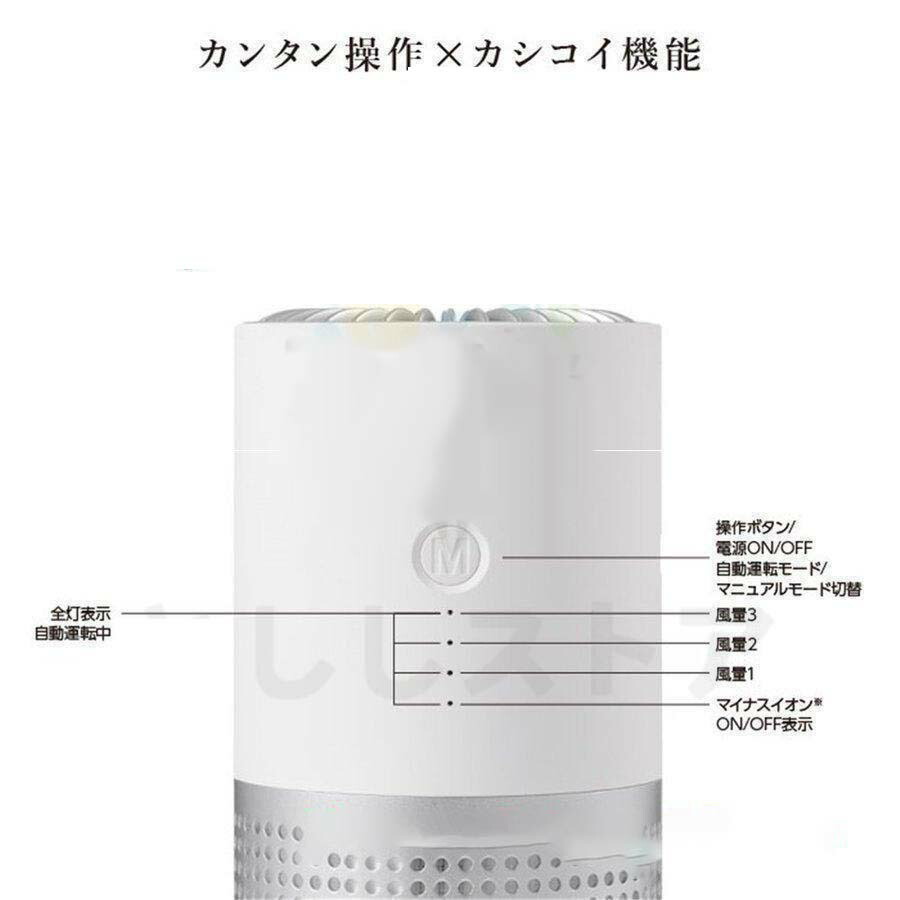 本空気清浄機は高効能フィルターを採用。大きな粒子(毛やホコリなど)を捕集しHPAEフィルターは99.97%の0.3μm以上の微粒子を濾過し活性炭フィルターは各種の臭いと有害なガスを除去。様々なほこり、エネルギー物質、ペットの臭い、タバコの匂い、花粉などに。