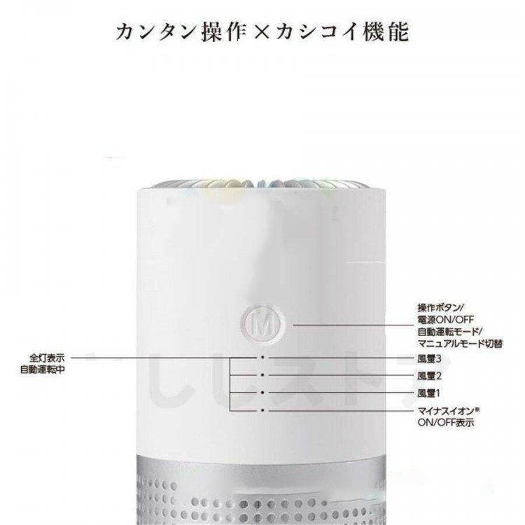 内蔵されたセンサーにより自動的にPM2.5、臭い、煙などを感知してくれ三色のランプ(緑、青、赤)によりキレイ、やや汚れてる、汚れているが表示され風量を自動的に調節してくれる。